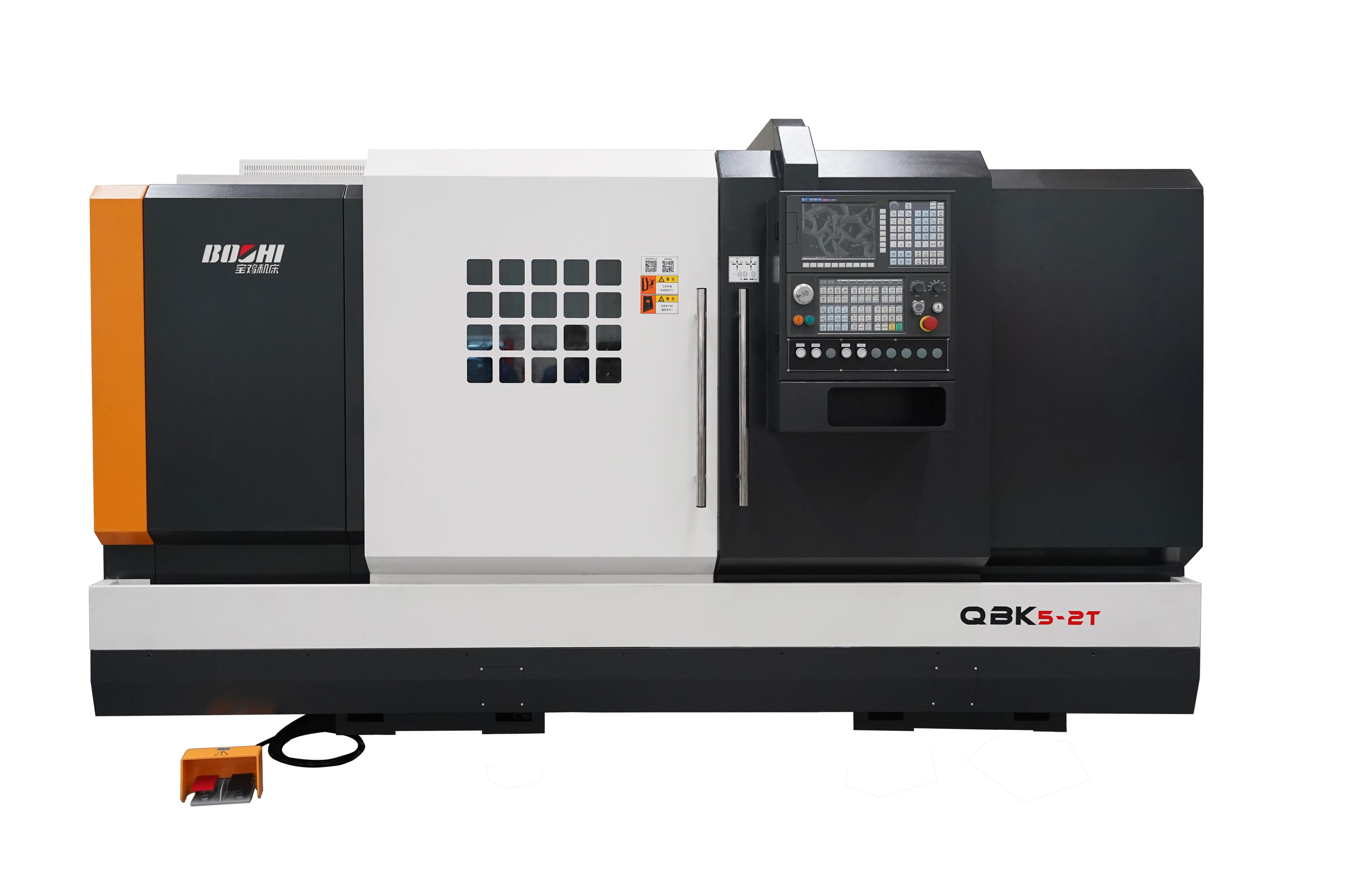 QBK5-2T数控车床是针对风电领域所用紧固螺栓加工而开发的一款中间驱动数控车床,该车床采用两个单侧液压驱动筒夹夹持工件中部,左右两侧各配置一组排式刀架,通过两侧刀具同时车削,实现对工件的一次装夹,完成两端外圆、端面的高效加工。为适用不同长度工件加工需求,两侧夹头间距可通过程序控制实现自动调整,方便快捷。